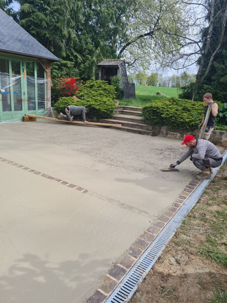 Réalisation de la terrasse en béton décoratif et des allées en sable stabilisé à Vezin-le-Coquet