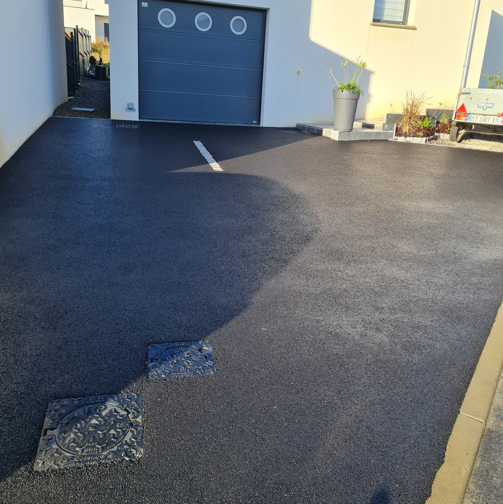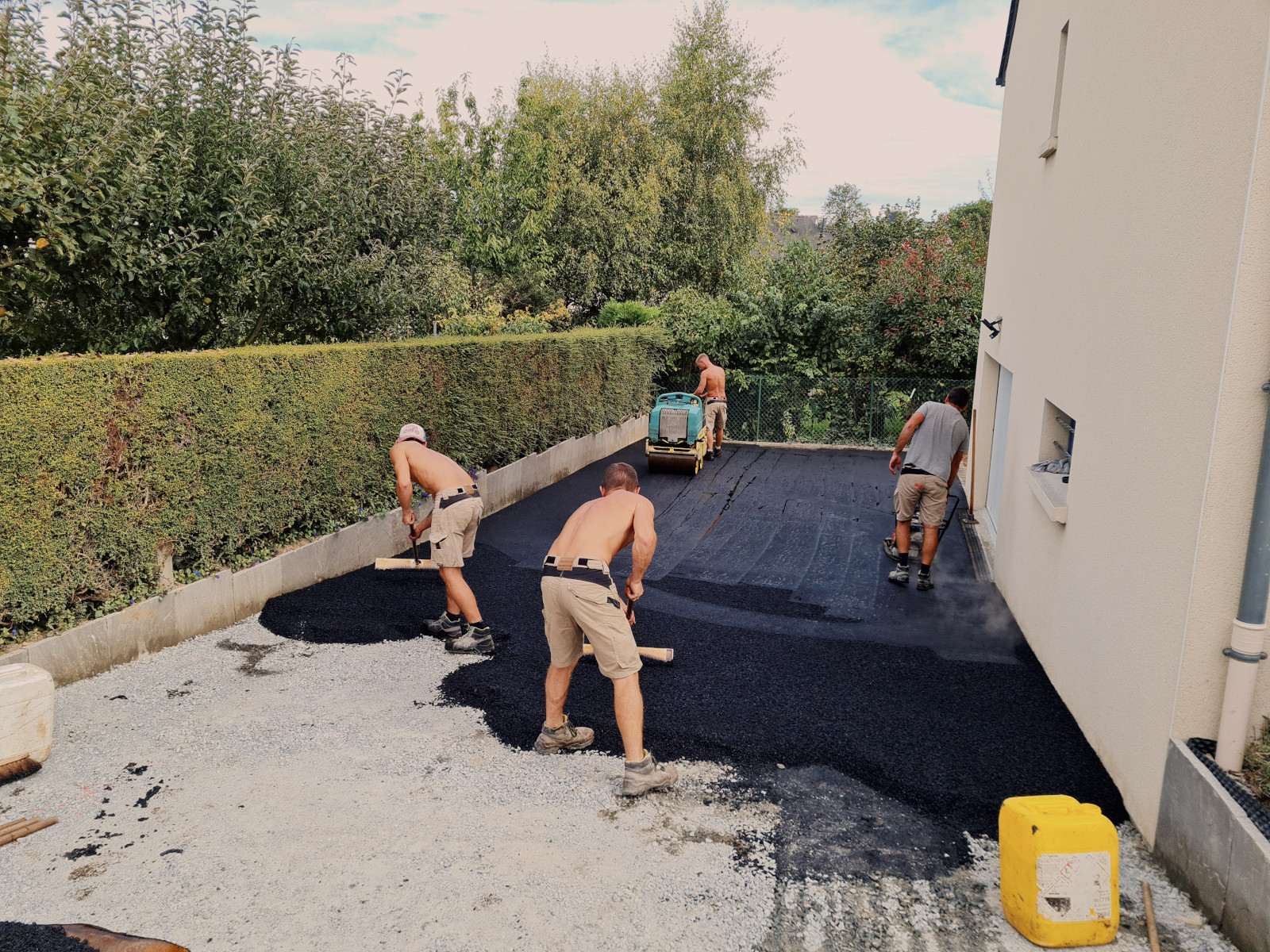 L’enrobé de bitume à chaud est souvent privilégié pour l’aménagement des allées de jardin ou des entrées de garage. Pratique, moderne et durable, sa pose peut toutefois être relativement coûteuse pour une petite surface. La solution ? Un aménagement groupé sur plusieurs propriétés limitrophes, comme réalisé par nos soins dans un lotissement de Liffré (35).