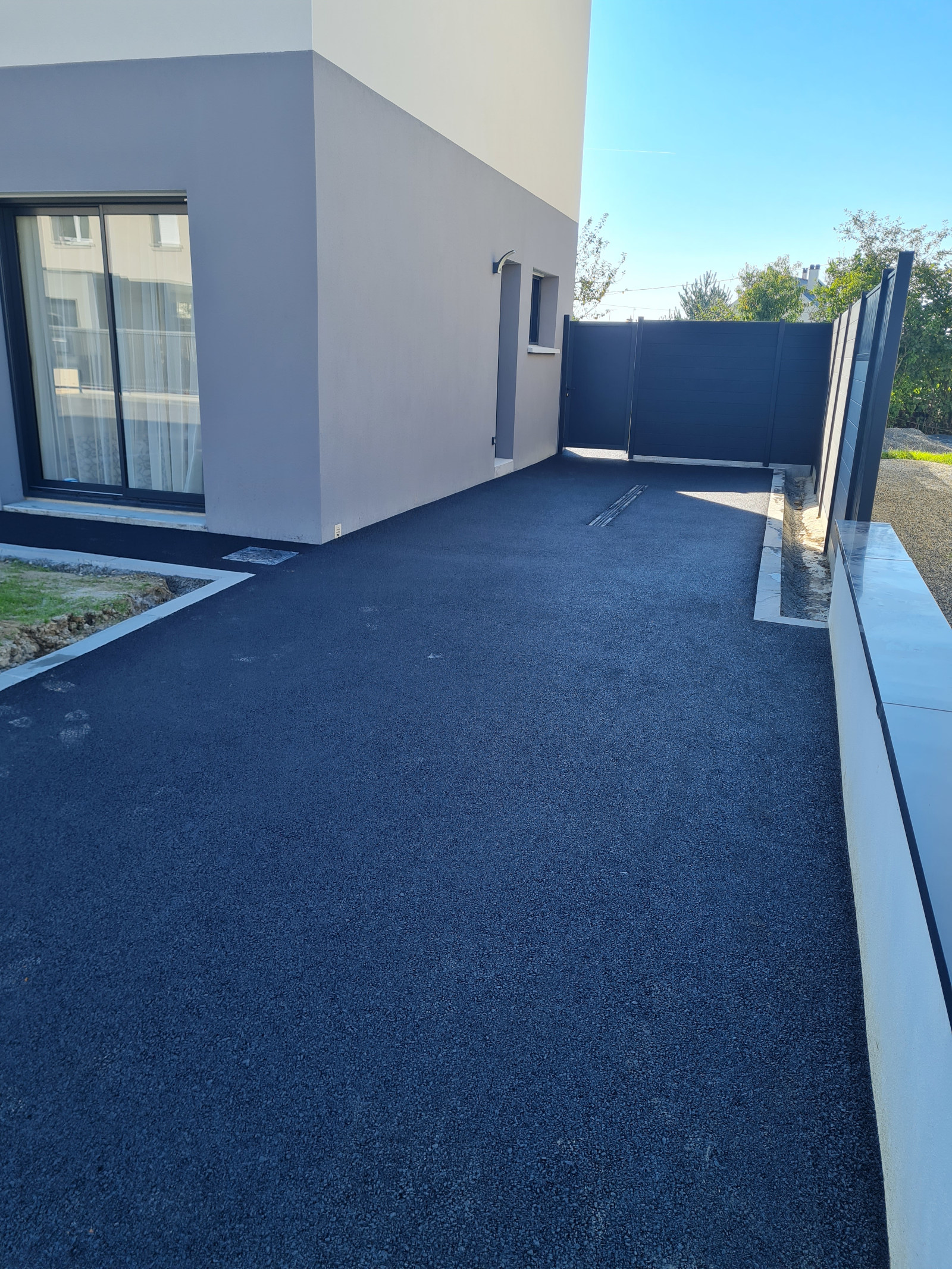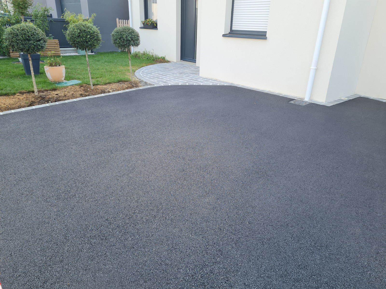 L’enrobé de bitume à chaud est souvent privilégié pour l’aménagement des allées de jardin ou des entrées de garage. Pratique, moderne et durable, sa pose peut toutefois être relativement coûteuse pour une petite surface. La solution ? Un aménagement groupé sur plusieurs propriétés limitrophes, comme réalisé par nos soins dans un lotissement de Liffré (35).